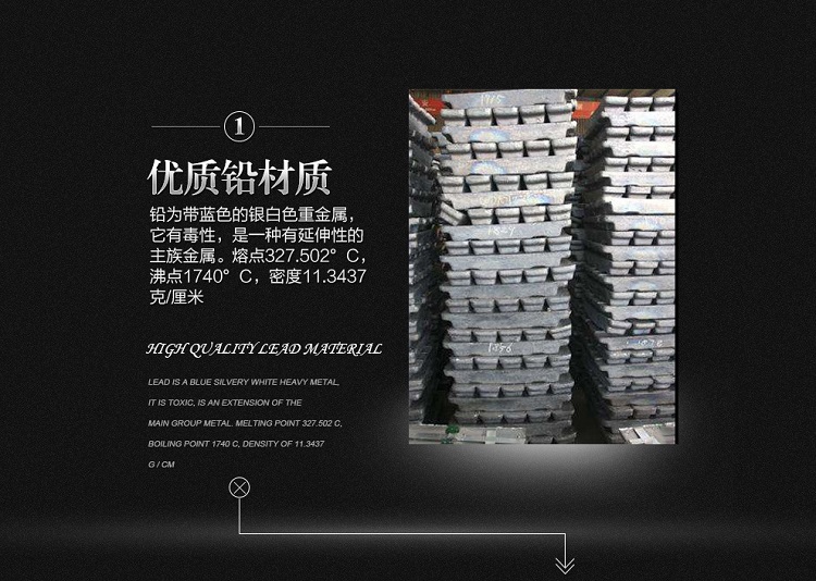 鉛錠呈長(zhǎng)方形、兩端有突出耳部,蘭白色金屬,較軟。密度11.34g/cm3,熔點(diǎn)327℃